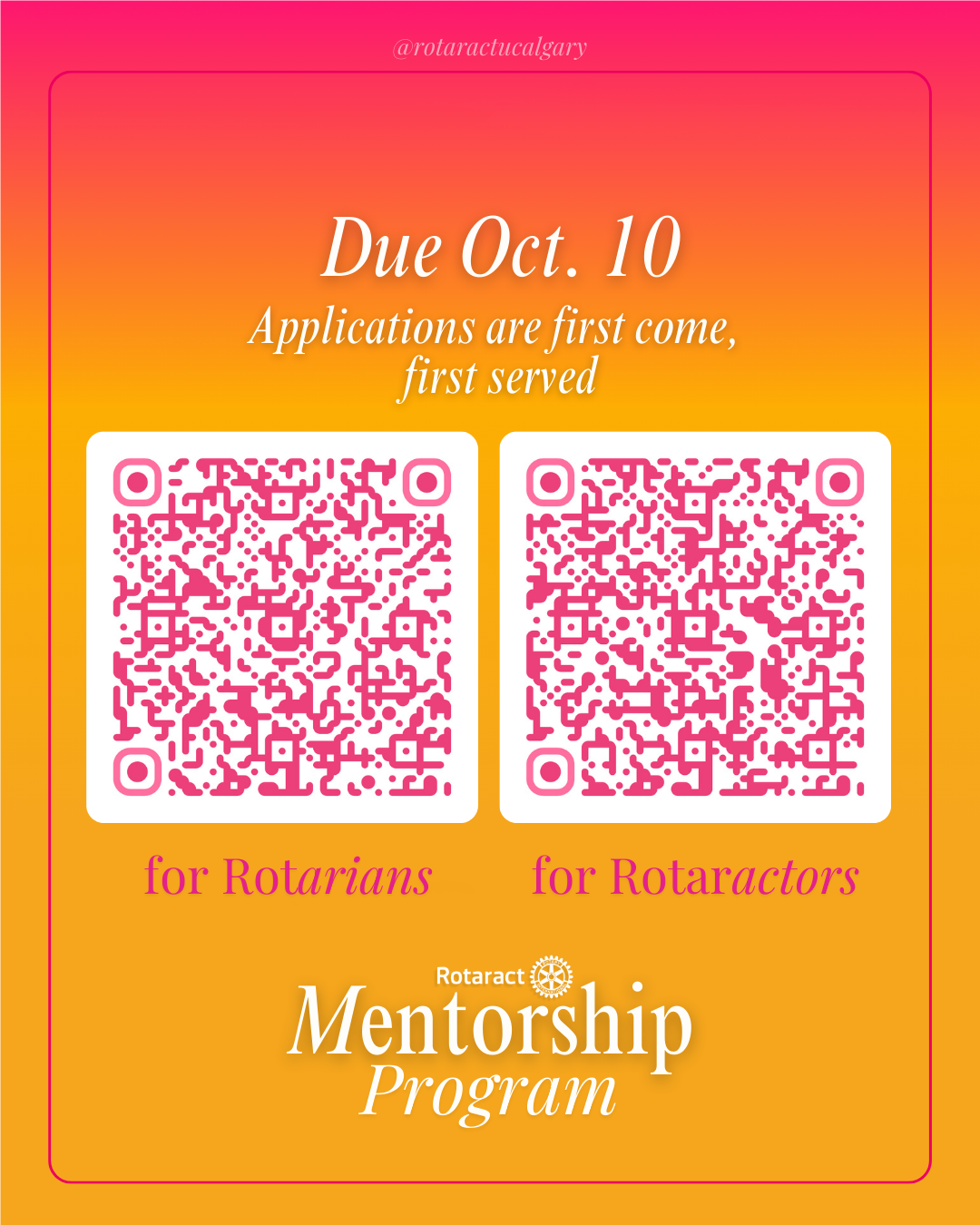 for all Rotarians and Rotaractors will be open until 11:59PM on Friday, October 10, 2025 This will be the final opportunity to sign up for the 2025 Rotaract-Rotary Mentorship Program. Shortly after, we will get back to registrants with their mentor/mentee matchup, and the program will
